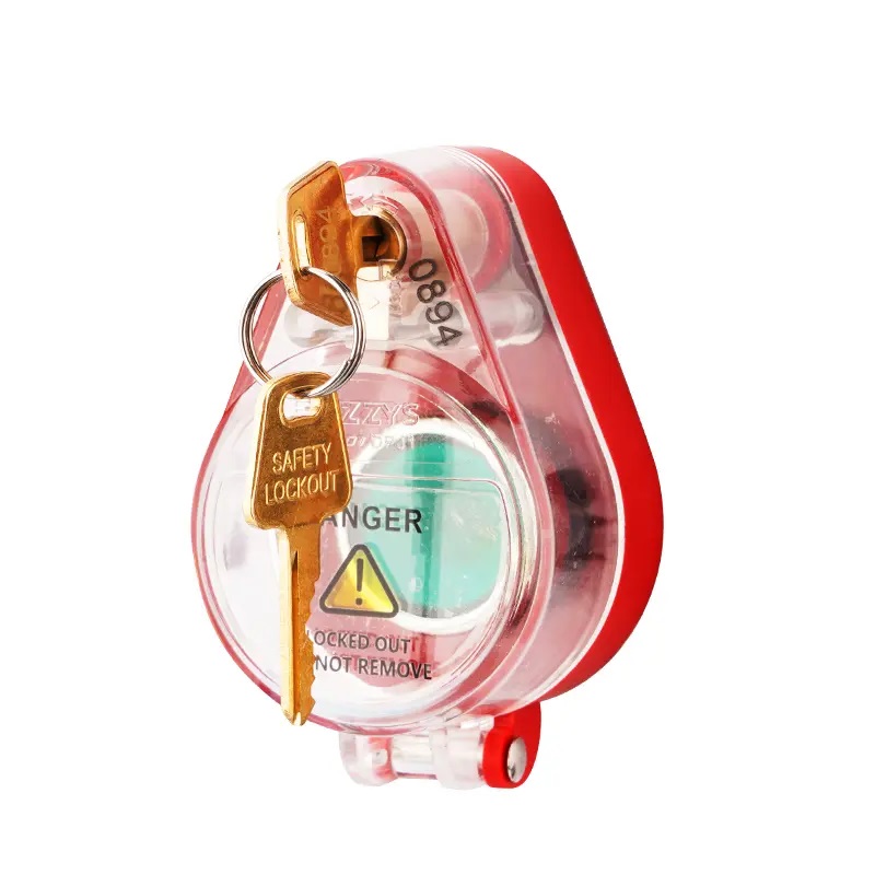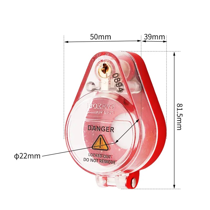 Блокиратор пусковой кнопки со встроенным замком DPJ1. Ключ и тело блокиратора имеют одинаковый уникальный номер для простой и быстрой идентификации.