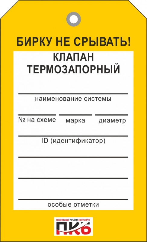 Информационная бирка "Клапан термозапорный". Изготовлена из пластика ПВХ, толщиной 0,3 мм, без ламинации, диаметр отверстия 7 мм. По желанию заказчика толщина бирки может быть увеличена до 1-2 мм. Нанесение текста необходимо производить маркером или шариковой ручкой. Размер 70 х 115 х 0,3 мм.